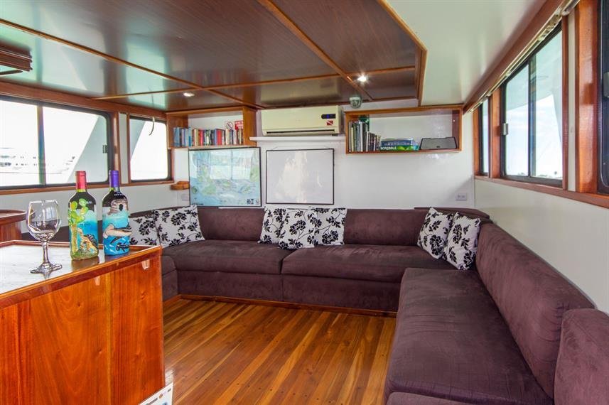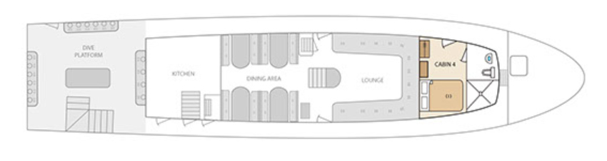 The diving platform offers space for all guests’ dive equipment, camera table, cleaning tanks with fresh water, and space for drying suits. Inside we have a lounge with air condition, TV, stereo, library, movies, table games, dinner room with air condition, a resting room with a bar and on the upper deck in the front is a sun deck.