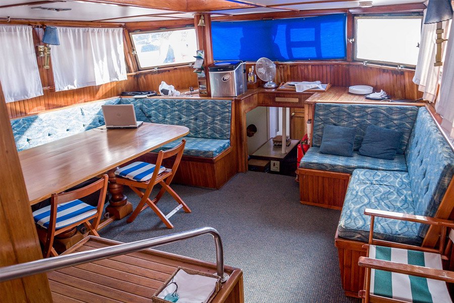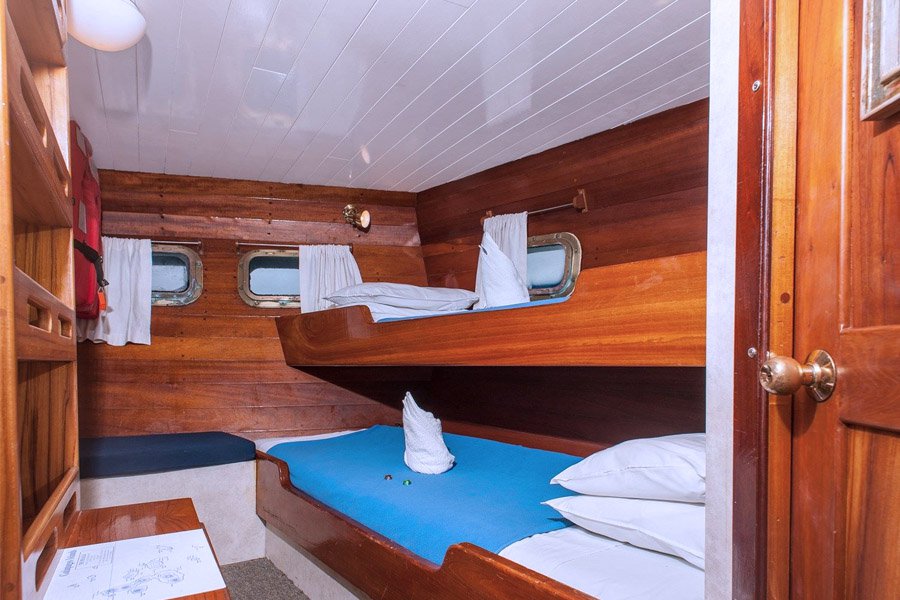 The Beagle is named after HMS Beagle, in which Charles Darwin made his famous voyage to the Galapagos Islands, and later wrote his theory of evolution based on his findings in this extraordinary archipelago. A magnificent 105-foot twin screw steel-hulled brigantine with teak decks and beautifully designed interiors, The Beagle is in a class by itself among sailing yachts in the Galapagos. She was built by Cubow Ltd. in Woolwich, England, in the 1970’s and registered with Lloyd’s (number Y 195095), but her designer is unknown. She’s been a charter vessel in the Islands for over a decade and has been substantially refurbished under her current ownership. You will feel the sensation of space aboard the Beagle for kicking back and relaxing between your unforgettable visits on land. The saloon offers a small library of Galapagos literature, and a selection of games. All around the wide decks, comfortable seating allows you to choose sunshine or shade for lounging and observation. Breakfast, lunch and dinner are served on board with the exception of the day you visit Puerto Ayora, when you will enjoy a meal in the highlands of Santa Cruz. Meals blend Ecuadorian and continental cuisine and are served on deck or in the saloon. Coffee and tea are available on deck, cold drinks including beer and a selection of wine and cocktails you may purchase from a well stocked bar. Refreshing snacks, especially at teatime, round out your daily menu