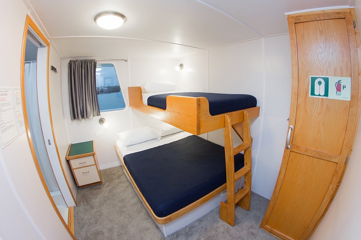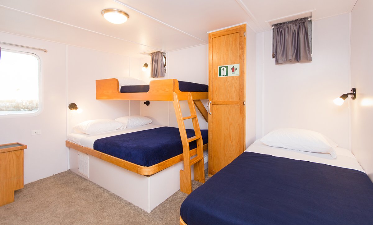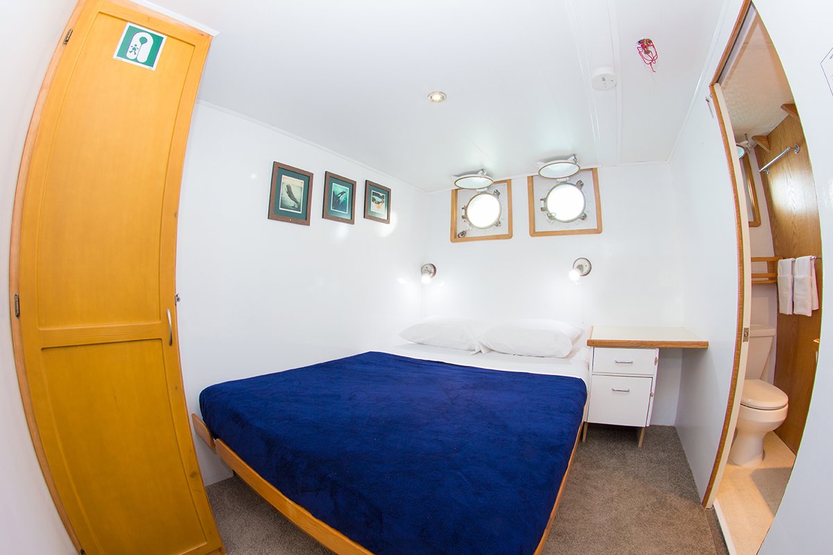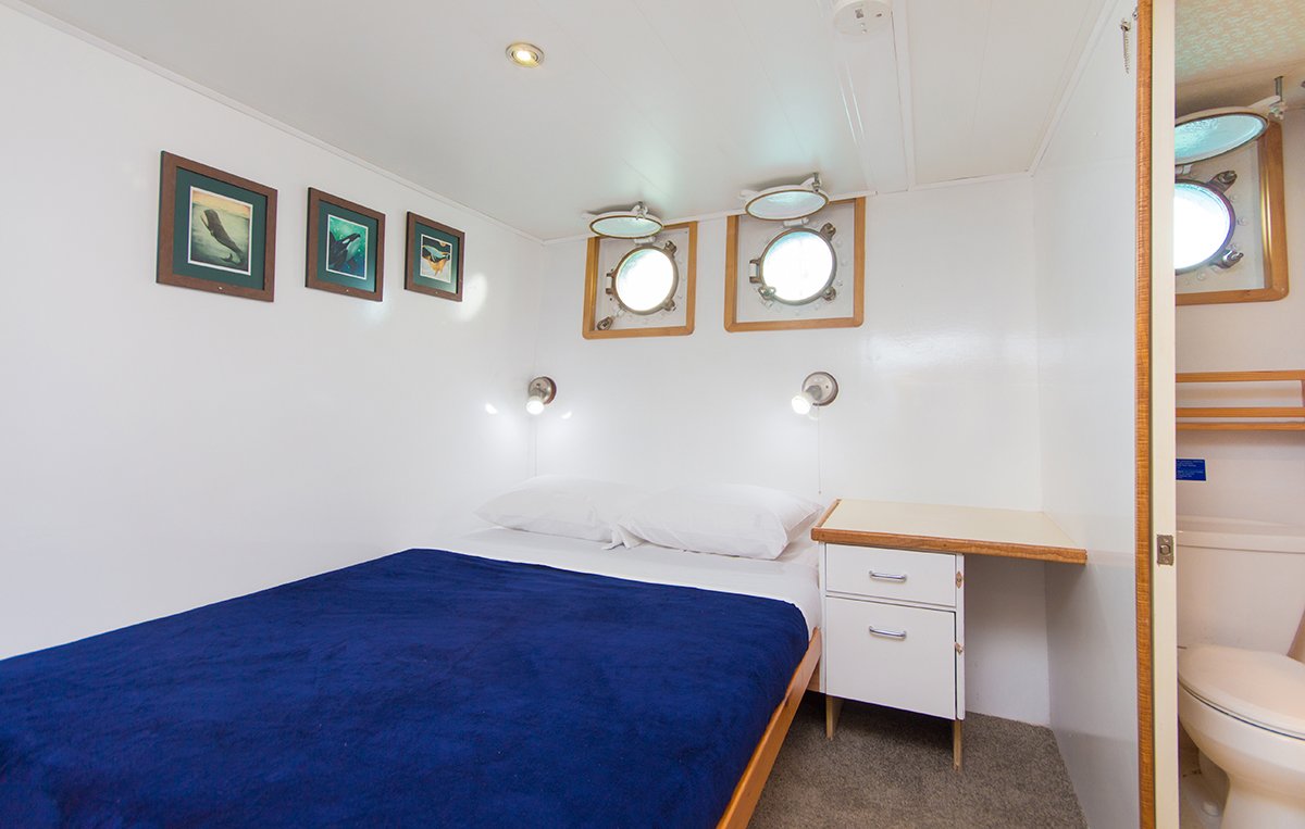 Cruise the Galapagos Islands in comfort aboard the Cachalote Explorer yacht. Built for stability and with fitted with modern amenities, she offers the perfect small-ship cruise in the Galapagos. Panoramic windows in the salon and open deck spaces create an inviting environment for all guests onboard. Enjoy breathtaking views whilst dining on freshly prepared local cuisine, or relax on the sundeck whilst keeping an eye out for whales and dolphins. Eight spacious cabins are spread out over the lower and upper decks. Cabins 1 & 2 are located on the upper deck and feature 1 queen bed plus 1 single bunk bed and ocean views. On the lower deck are 5 queen bed cabins and 1 twin. All cabins feature individually controlled air-conditioning, storage space and private en-suite bathrooms.