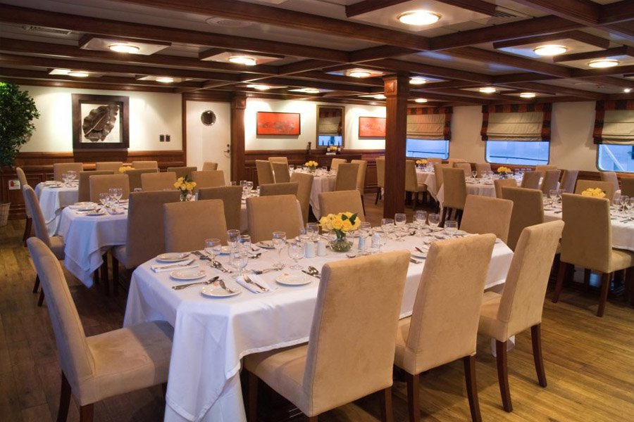 The Eclipse's features include a library, a boutique, a lounge and an infirmary, with a doctor on board at all times. One of the most popular areas on board is the observation/sun deck, ideal for stargazing, whale watching, or simply lazing in the Jacuzzi. In addition to the elegant indoor dining room, there is an al fresco dining area, where you can enjoy the islands’ spectacular scenery. All meals are served as a buffet style with all soft drinks included.