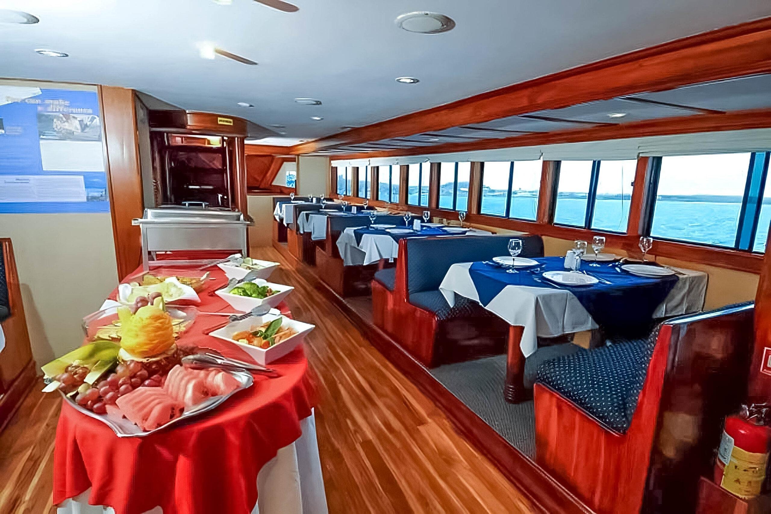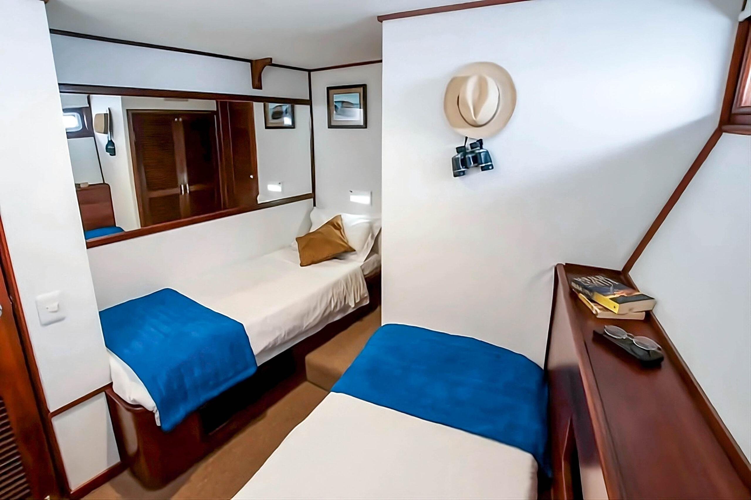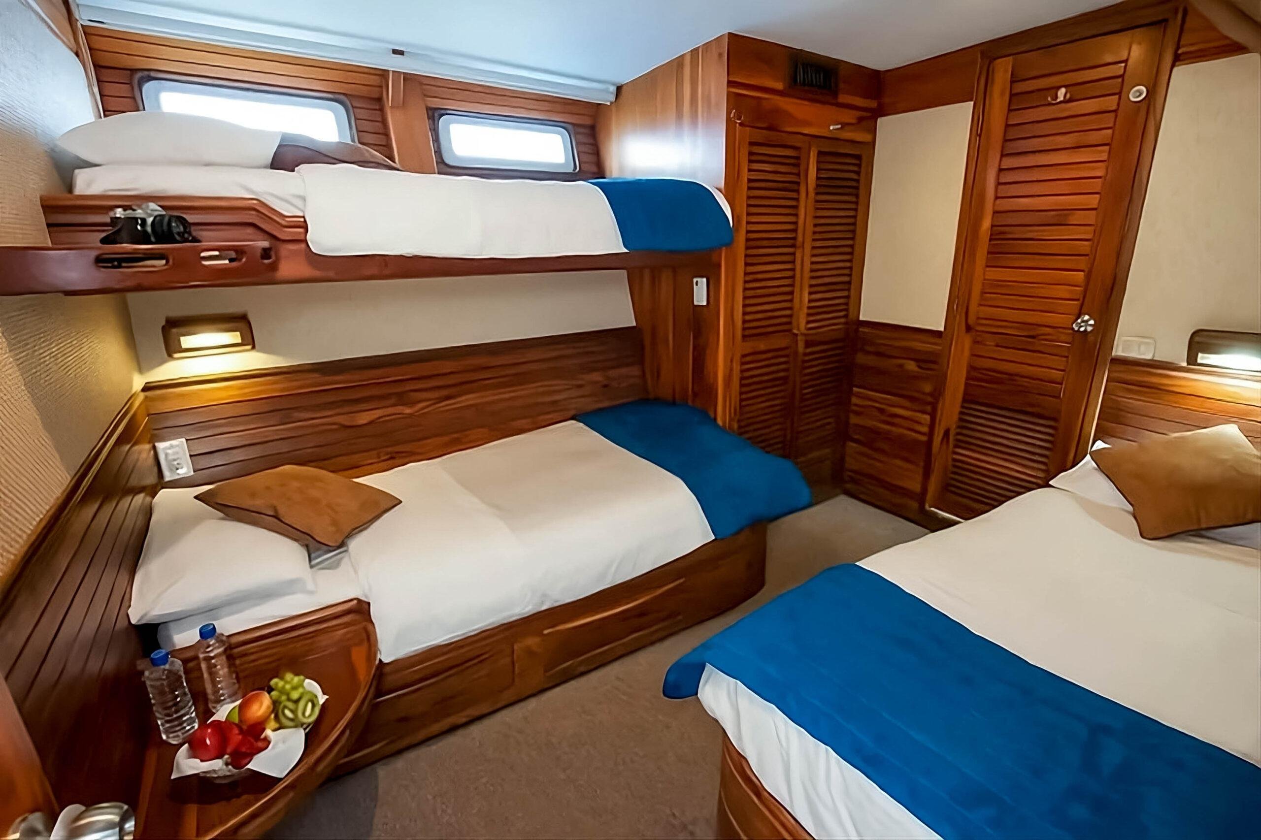 The renewed Letty Yacht Galapagos of comfort and ample space on board while cruising around the Galapagos islands. Its oceans-front cabins offer unparalleled comford and private facilities. The Yacht Letty has eight fully equipped cabins with private bathrooms, hot showers, windows, and air conditioning. It has a 16-passenger capacity and a crew of seven, ensuring you receive personalized attention throughout your trip 4 Upper deck cabins with panoramic windows and 4 Lower deck cabins with portholes to accommodate up to 16 guests for a naturalist adventure of a lifetime; 2 Lower Deck cabins can be enjoyed as Triple cabins, ideal for small family or friends. A special plus on board our Yacht for our valued guests is that we can offer WiFi service at no extra cost (signal may vary between locations).
