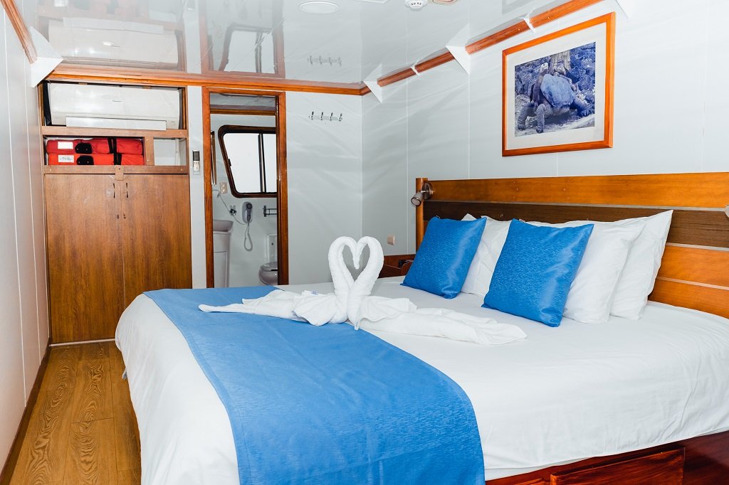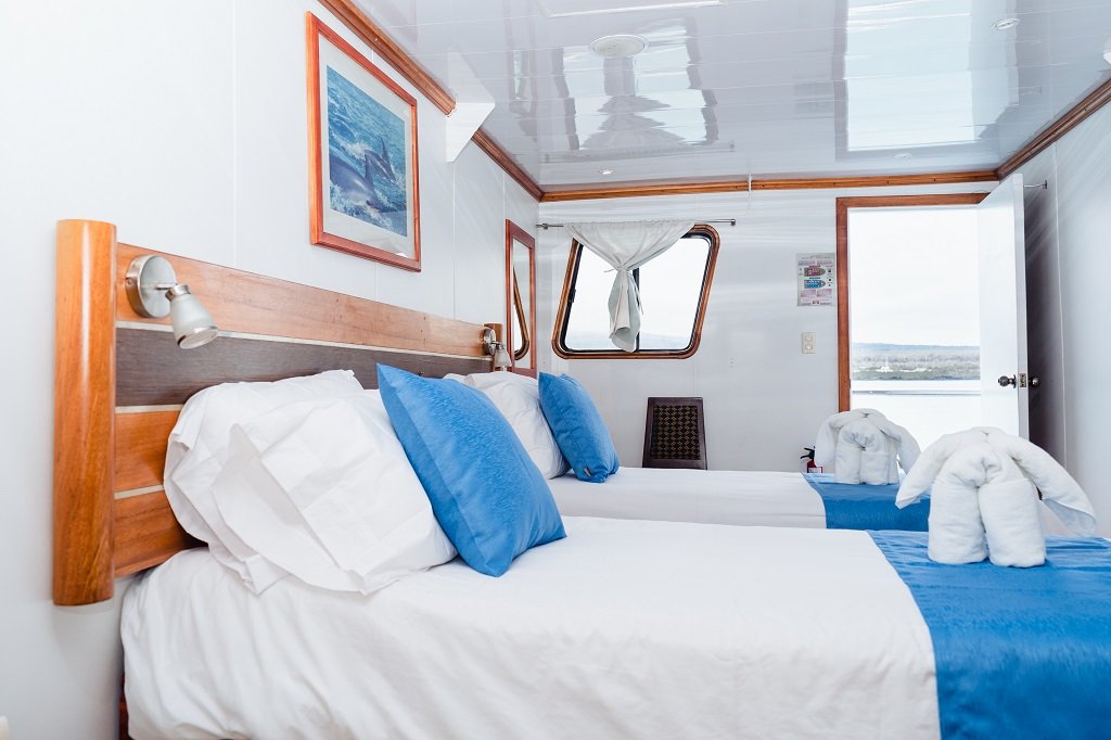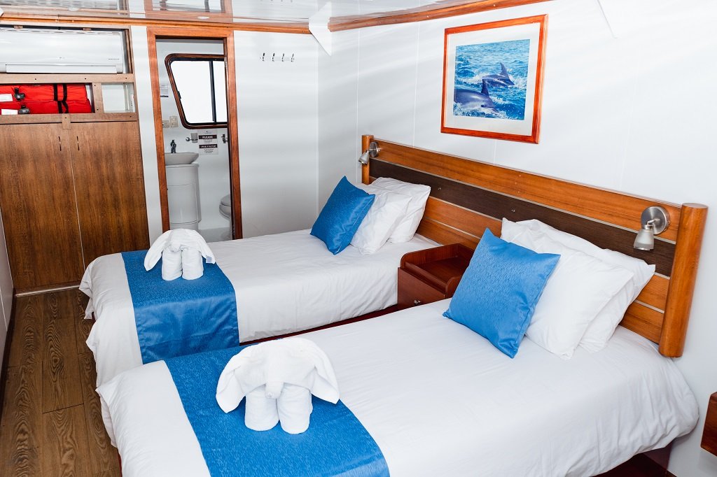 CABIN AMENITIES: All cabins are ensuite, with ocean view, two queen size beds, private bath-shower, and come with a small safe box and intercom system. |