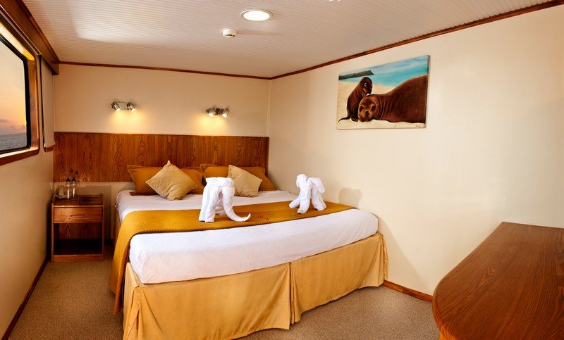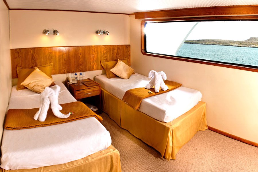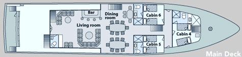 Nine well-appointed cabins are available, each with private bathrooms with hot/cold water showers, air-conditioning, hairdryer, internal telephones and safety deposit box. Two cabins are located on the lower deck, 3 on the main deck and 4 on the upper deck. Cabins can be configured to either 2 single or 1 double bed.
