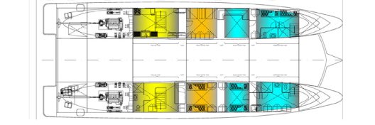 Topside the EcoGalaxy Eco Catamaran caters to just 16 guests in 8 cabins. Four cabins are located on the upper deck, and four are on the main deck, each with AC, private bathrooms with hot and cold water showers, hairdryer, internal telephone and safety deposit box. The upper deck cabins can be interconnected, and all cabins have the choice of either twin or matrimonial bedding. Social areas include a library, indoor lounge with entertainment area, fully stocked bar, dining room and sun deck with loungers.