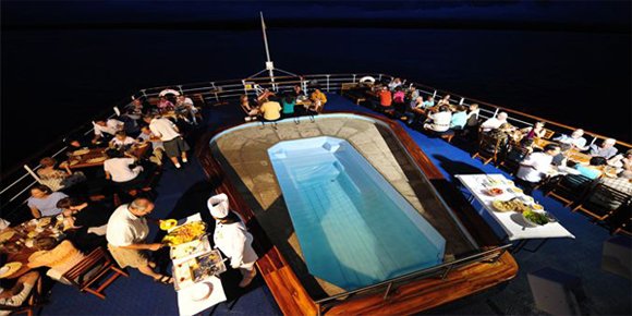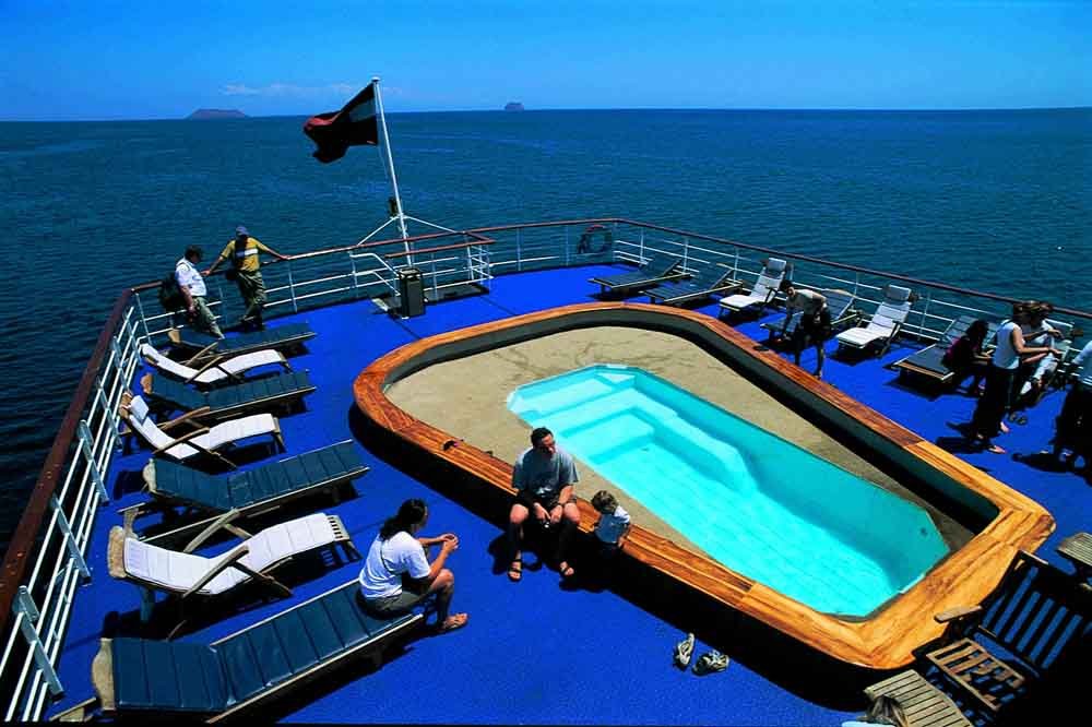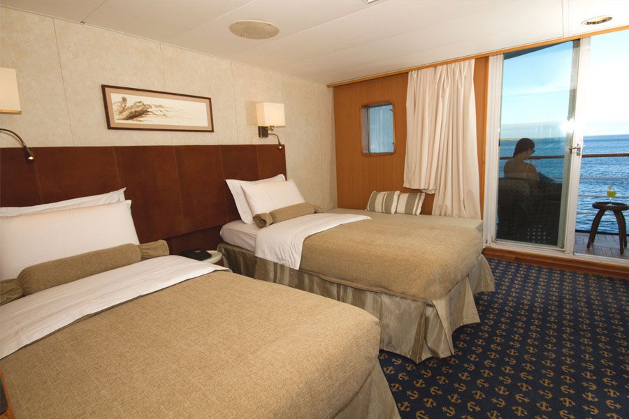 Built in 2002 and renovated in 2016, the 55-cabin M/V Galapagos Legend can accommodate up to 100 guests per small ship cruise. All en suite cabins have a TV, air conditioning, ample storage space, and either a window or a porthole. Some cabins have a balcony. Family cabins are available. Kayaks and snorkelling equipment are carried onboard. Paid Wi-Fi is available. The ship has excellent leisure facilities, including a gym, Jacuzzi, and swimming pool. Relax on the sun terrace, in the indoor salon and bar, and at the upper deck outdoor lounge and BBQ area. You'll also find a boutique, a library, and an auditorium. There's a children's area for younger guests. Delicious local food and Western fare is served in the spacious dining room.