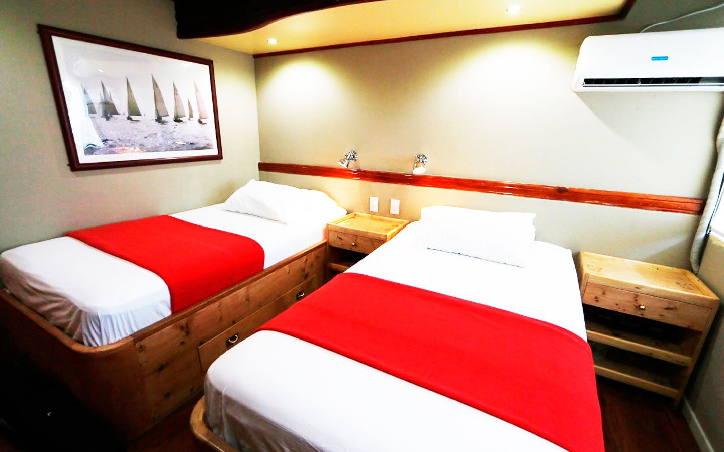 The Millennium is a sleek catamaran that offers great guest facilities, modern safety equipment, and high standards of comfort for small ship cruises around the awe-inspiring Galapagos. She can accommodate up to 16 passengers per voyage in eight spacious en suite cabins. Cabins have air conditioning and adequate storage space, and you’re sure to sleep soundly after each special day. Explore the wonders of the underwater world with the provided snorkelling equipment, or take it easy and watch the world go by from the comfort of the sun deck. Bury your head in a book from the small onboard library or learn more about the local nature and wildlife from the experienced naturalist who accompanies each trip. There is also a TV/DVD player on the boat. The vessel has both indoor and outdoor dining areas and you can enjoy tasty food as you chat with the other passengers in a friendly and intimate atmosphere.
