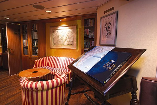 The ship includes a covered deck with chairs and tables, a sun deck, a lounge with a full-service bar and facilities for films, slide shows, and presentations. Public areas also include a library, a gift shop, a fitness center, a spa, a sauna, and a small swimming pool. A full-time doctor, an undersea specialist, a photo instructor, a video chronicler, and a wellness specialist accompany every voyage; and Internet access and laundry service are available on board.