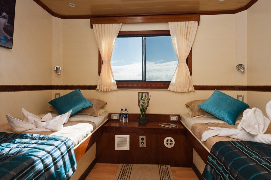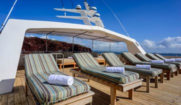 Topside, the M/C Galapagos Seaman Journey caters to just 16 guests, offering the perfect blend of small groups & personalised service, but also great camaraderie with your fellow passengers. There are 8 private cabins on board, 2 upper deck suites and 6 ocean view cabins. Each room fratures individually controlled AC, storage space, hair-dryer and en-suite bathroom. Built for stability, comfort and size, the Seaman Journey offers plenty of quiet spaces to relax. Enjoy stunning ocean and sunset views up on the sun deck whilst relaxing with a beer or cocktail from the bar. All meals are served in either the indoor or al fresco dining areas, and are freshly prepared using high-quality ingredients.