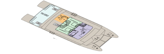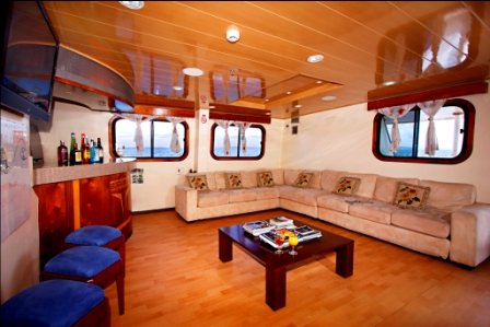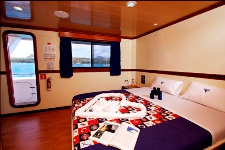 9 large, beautiful and comfortable double cabins with outside views, private bathroom, cold/hot water, locker and closet, comfortable dining room, two bars and a lounge, library, full air conditioning with control in each cabin, TV, DVD, stereo, first aid, ice maker, water purifier, observation deck and spacious sundeck with chairs for sleeping and relaxing.