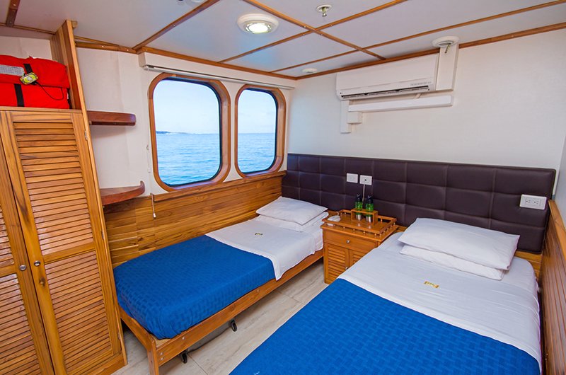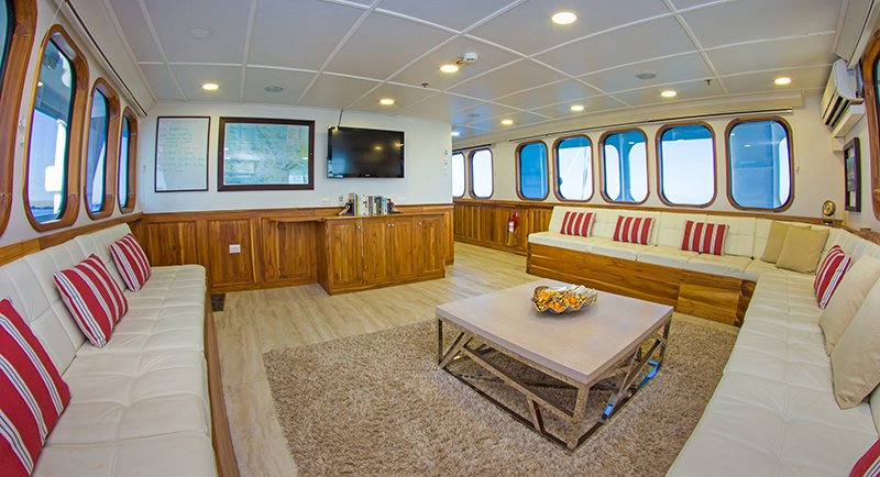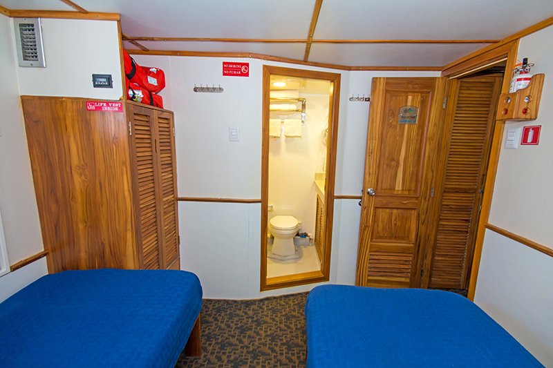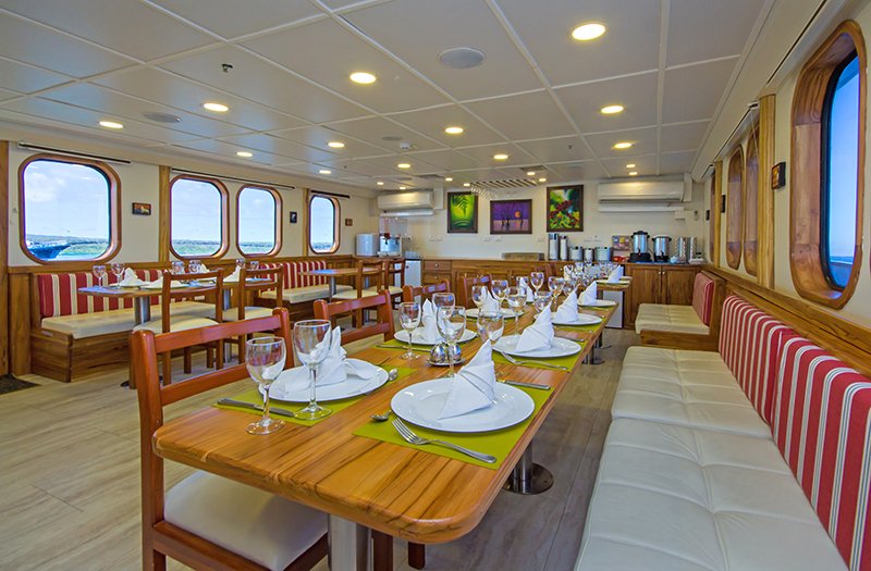 The Tip Top IV, launched in 2006 is a first-class yacht offering small ship cruises to the Galapagos Islands. Catering to just 16 guests, she offers personalised service and amazing adventures. There are 10 cabins on board, spaced over the the lower and upper deck. Each cabin has AC, private bathrooms, lockers, drawers and safety box. All cabins offer the choice of twin or double beds. The main deck is home to the spacious salon with entertainment system & dining area, whilst there is a lovely outdoor lounge on the upper deck which is a great place to enjoy the views and cooling sea breeze. On the top deck is a spacious sun deck kitted out with comfortable loungers and a shaded area.