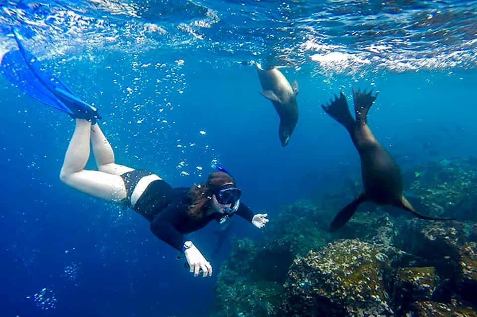 Am: Santa Cruz Island bay tour, includes snorkeling in La Loberia and hiking around the island. We will visit the Shark Channel (Tintoreras) and the Lovers Channel (Canal Del Amor) then we will walk to the cristal clear waters of Las Grietas.