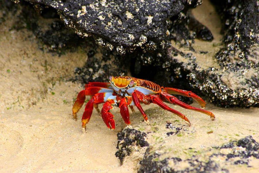 At Punta Cormorant, there is a green olivine beach to see sea lions and a short walk past a lagoon to see flamingos, rays, sea turtles, and Grapsus grapsus (Sally Lightfoot)crabs. Pink flamingos and green sea turtles nest from December to May on this island. The "joint footed" petrel is found here, a nocturnal sea bird which spends most of its life away from land.