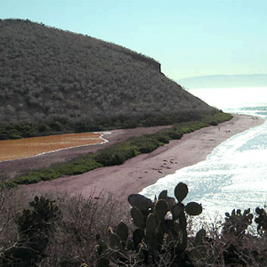 Southwest of Santiago Island at a deep drop of over 100 m, Galapagos sharks mingle with sea turtles and feeding marine iguanas.